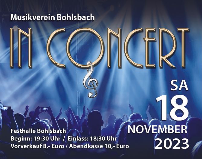 Bereits schon heute laden wir, die Musikerinnen und Musiker des Musikverein Harmonie Bohlsbach, Sie zu unserem Jahreskonzert 2021 am Samstag, den 06. November 2021, um 19:30 Uhr, in die Festhalle Bohlsbach ein. Schon seit einigen Wochen bereiten wir uns intensiv und mit viel Spielfreude auf das musikalische Highlight „in concert“ vor. Unser Dirigent Beni Litterst hat ein abwechslungsreiches, unterhaltsames sowie kurzweiliges Konzertprogramm für Sie zusammengestellt. Wir werden Ihren musikalischen Geschmack auf den Punkt treffen. Seien Sie gespannt … Aus diesem Grund merken Sie sich bitte jetzt schon den 06. November 2021 vor. Weitere Informationen folgen.